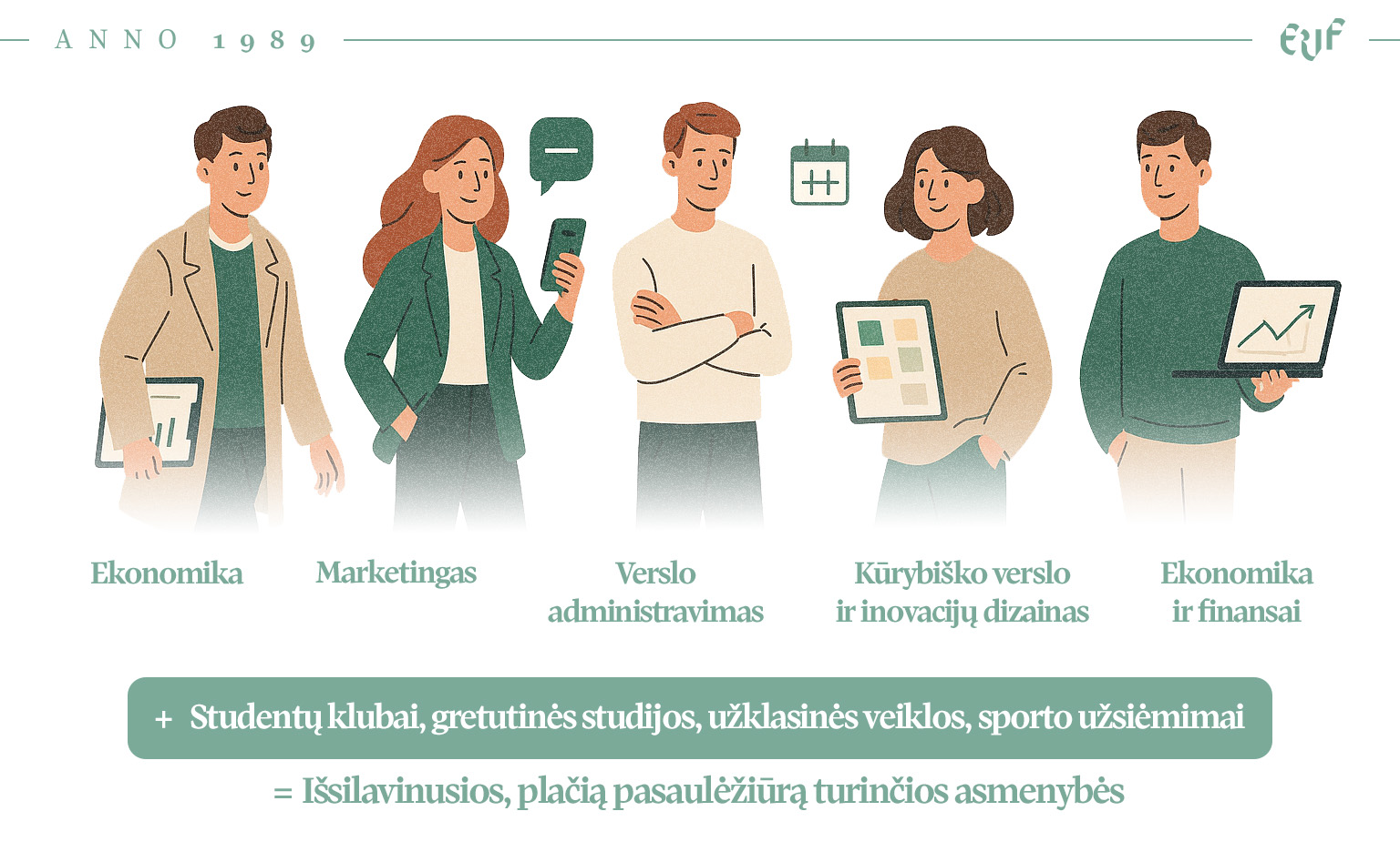 - Kūrybiško verslo ir inovacijų dizainas. Tinka: jei įdomu, kaip kurti idėjas ir sprendimus, kurių žmonėms tikrai reikia; norintiems keisti kasdienybę ir kurti modernų rytojų.